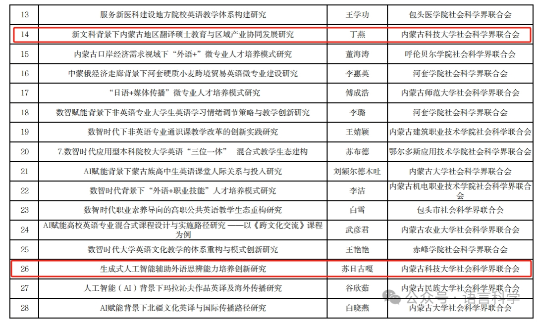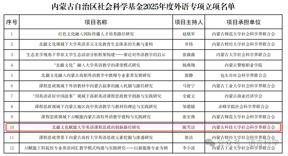 近日,内蒙古自治区社会科学基金2025年度外语专项立项名单正式公布,内蒙古科技大学外国语学院丁燕、陈雪洁、苏日古嘎、冀淑辛四位老师的课题成功获批,这一成果标志着学院在科研创新与学科建设方面迈出重要步伐。