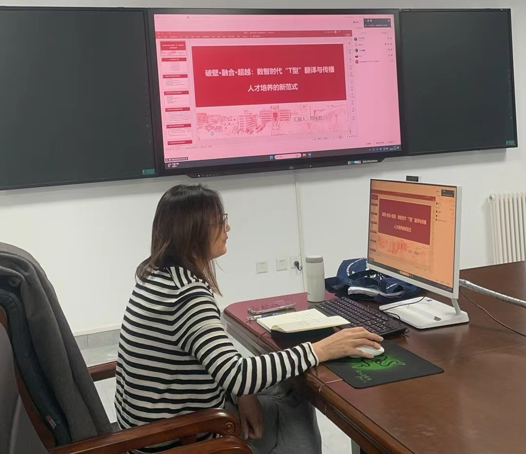 在讲座中,穆雷教授深以“翻译专业教育发展中的问题与探索”为题,结合国内外翻译教育的发展历程与现实案例,系统剖析了当下翻译专业在课程体系适配性、师资队伍专业化、理论与实践融合度、人才培养与市场需求对接等方面存在的突出问题,并从学科定位优化、课程模块创新、实践平台搭建、评价体系完善等多个维度,提出了一系列兼具可行性与前瞻性的探索路径。随后,周桂君教授以“破壁融合超越:数智时代,‘T型’翻译与传播人才培养的新范式”为主题,点明了高端译传人才培养的必要性,指出当前学位点需在扩大规模后转向质量升级,回应了穆雷教授提出的学科布局与资源配置问题。